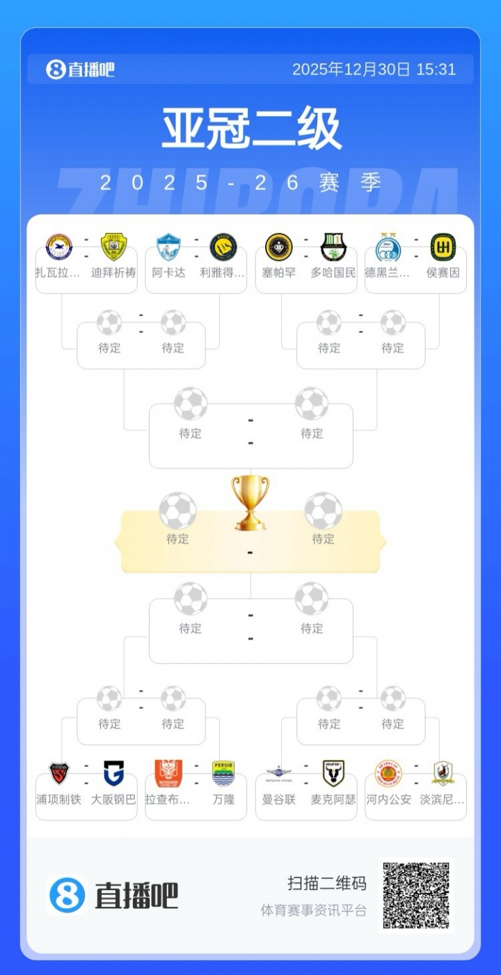 12月30日讯 今日15:00,亚冠二级联赛16强抽签仪式举行,利雅得胜利战土库曼斯坦球队阿卡达,大阪钢巴遭遇浦项制铁,完整对阵如下。